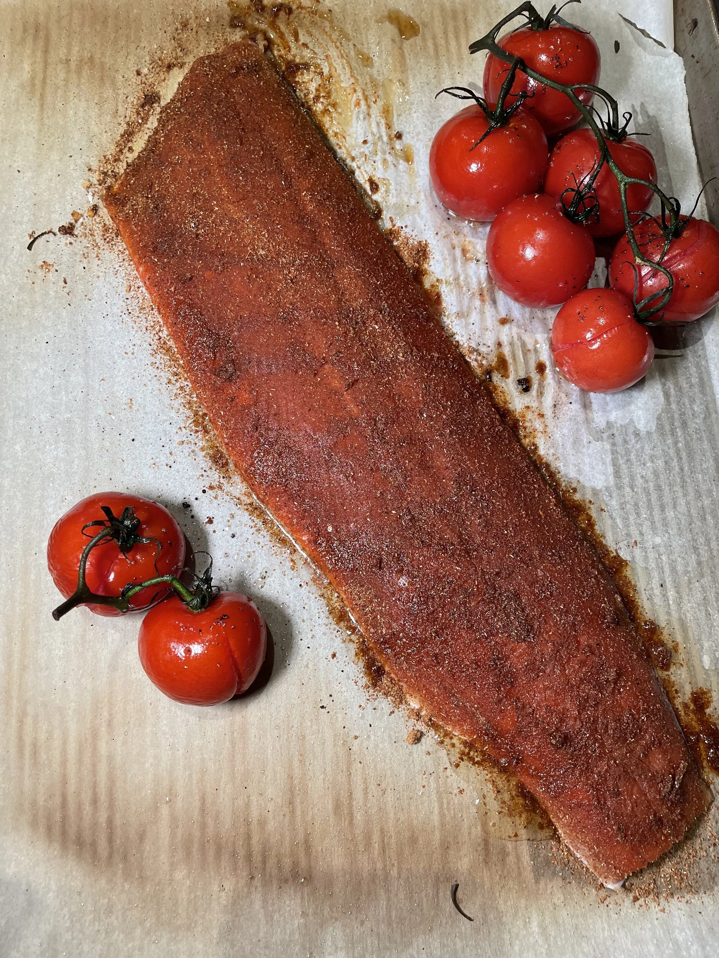 In a small bowl, mix together all of the spices to make a rub for the salmon. Pour the avocado oil on the salmon and rub gently. Sprinkle the salmon with the price mixture until well coated and gently rub in, blending with the oil.